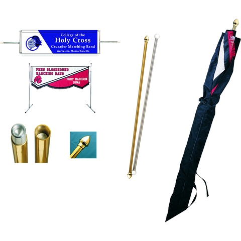 The Banner Stand includes two 6' upright poles, two 3' base poles with black rubber tips, and two double parallel clamps to attach to any existing banner frame. The stand does not include the banner or the banner frame.